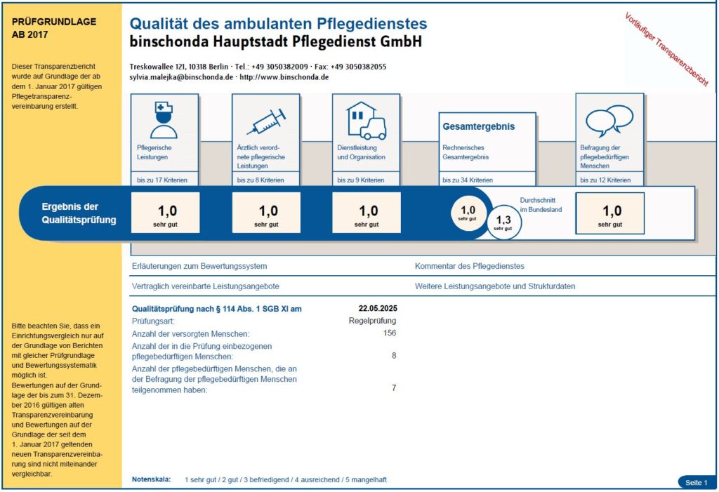 Der Medizinische Dienst der Krankenversicherung (MDK) prüft alljährlich alle ambulanten und stationären Pflegeeinrichtungen. Die Leistungen von binschonda werden seit Jahren mit gut und sehr gut bewertet. Das heißt, unsere Klienten zu Hause und die Bewohner in den ambulant betreuten Pflege-Wohngemeinschaften sind bei binschonda insgesamt sehr gut versorgt.
